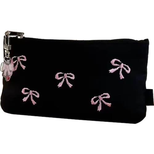 Material: tela Peso: 100 g Tamanho: 210 mm* 80 mm Bordado charmoso em laço — apresenta um delicado design de laço rosa, adicionando um toque macio e feminino, perfeito para estudantes e meninas que adoram artigos de papelaria fofos. Grande capacidade — oferece amplo espaço para organizar canetas, lápis, borrachas, marcadores e outros itens de papelaria, mantendo tudo arrumado e fácil de acessar. Material de lona durável — Feito de lona de alta qualidade, este estojo de lápis é resistente e leve, garantindo um uso duradouro. Design simples e elegante — Uma cor preta elegante combinada com um design bordado minimalista e charmoso, ideal para escola, escritório ou uso diário. Perfeito para estudantes — Projetado para meninas e estudantes que apreciam estilo e funcionalidade, adequado para uso no ensino fundamental, médio e universitário.