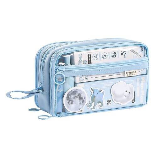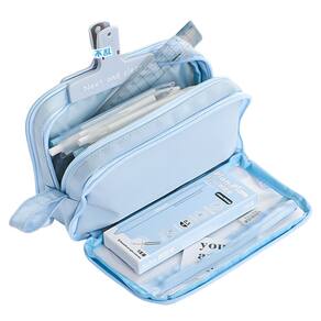 Material: Peso do tecido: 100g Tamanho: 210 mm* 65 mm* 130 mm Design espaçoso: apresenta uma grande capacidade com vários compartimentos para armazenar canetas, lápis e outros materiais de papelaria de forma organizada. Apelo estético: design transparente azul elegante com adesivos fofos, ideal para estudantes e funcionários de escritório que adoram uma solução de armazenamento moderna e funcional. Material durável: feito de tecido de alta qualidade, garantindo um uso duradouro e, ao mesmo tempo, leve e portátil para conveniência em qualquer lugar. Uso versátil: perfeito para uso escolar, universitário e de escritório. Adequado para armazenar canetas, marcadores, borrachas e outros acessórios pequenos. Prático e funcional: possui um fecho de zíper seguro e alça portátil, facilitando o transporte em mochilas ou malas de mão sem se preocupar com derramamentos.