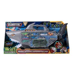 Estojo de Transporte Robo Shark Transportador - Fun F0111-5 O passado e o presente colidem com o Robo Shark Transporter. Este estojo de transporte durável com tema de tubarão é fácil de transportar e empurrar, pois possui rodas móveis livres, uma alça de transporte para brincadeiras móveis e tem espaço de armazenamento para até 24 carros. Com recursos adicionais que incluem luzes e sons, mandíbulas de abertura, uma rampa de velocidade integrada e um lançador de mísseis. O Robô Shark Transporter inclui 2 tubarões, 2 veículos de resgate marítimo, 2 figuras de tubarão e 3 mísseis. Os veículos incluídos apresentam detalhes de alta qualidade e rodas móveis independentes. Utiliza 2 pilhas AAA.