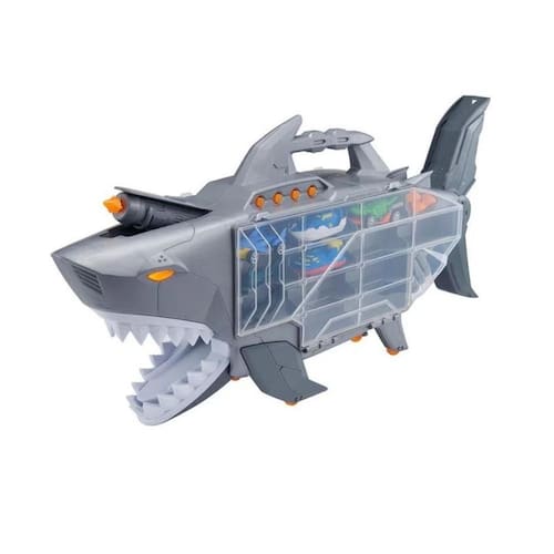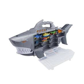 Estojo de Transporte Robo Shark Transportador - Fun F0111-5 O passado e o presente colidem com o Robo Shark Transporter. Este estojo de transporte durável com tema de tubarão é fácil de transportar e empurrar, pois possui rodas móveis livres, uma alça de transporte para brincadeiras móveis e tem espaço de armazenamento para até 24 carros. Com recursos adicionais que incluem luzes e sons, mandíbulas de abertura, uma rampa de velocidade integrada e um lançador de mísseis. O Robô Shark Transporter inclui 2 tubarões, 2 veículos de resgate marítimo, 2 figuras de tubarão e 3 mísseis. Os veículos incluídos apresentam detalhes de alta qualidade e rodas móveis independentes. Utiliza 2 pilhas AAA.