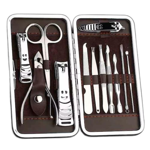 - Kit de unha com 12 peças: 1 cortador de unha grande, 1 cortador de unha médio, 1 cortador de unha pequeno, 1 alicate, 1 lixa, 1 pinça, 1 palito, 2 utensílios de desencravar unha, 1 tesourinha