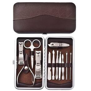 - Kit de unha com 12 peças: 1 cortador de unha grande, 1 cortador de unha médio, 1 cortador de unha pequeno, 1 alicate, 1 lixa, 1 pinça, 1 palito, 2 utensílios de desencravar unha, 1 tesourinha