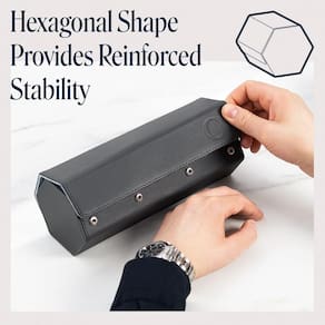 Rolo de relógio de viagem para amantes de relógios de luxo — relógios premium merecem uma capa premium para protegê-los e exibi-los. Nosso rolo de relógio hexagonal de couro napa com interior de veludo foi feito para dar aos seus relógios a experiência Rolls Royce