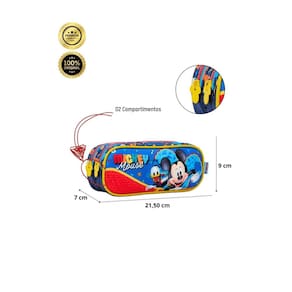 Design exclusivo: Estampa do Mickey Mouse com detalhes encantadores. Dois compartimentos: Espaço amplo para organizar lápis de cor, canetas, borrachas e outros materiais. Fechamento por zíper: Facilita o acesso aos compartimentos. Cursor personalizado: Um toque especial que os meninos vão adorar. Material resistente: Garante durabilidade e resistência no dia a dia escolar.