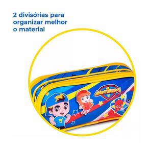 Esse estojo escolar é personalizado com a estampa dos Aventureiros, tornando-o ainda mais divertido e atrativo para os pequenos. Ele está disponível nas cores azul, vermelho e amarelo.