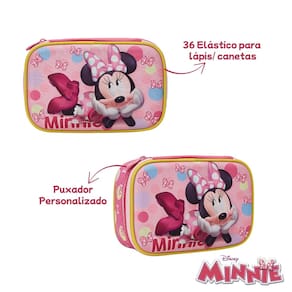 Organização e charme no mesmo produto! O estojo box da Minnie possui amplo espaço interno com 36 elásticos para lápis ou canetas, comportando até 100 itens. Ideal para a rotina escolar das pequenas, com design encantador, zíper resistente e acabamento caprichado com a personagem mais amada da Disney!