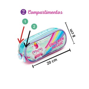 Este estojo escolar duplo é perfeito para os estudantes que adoram unicórnios e arco-íris. Com dois compartimentos espaçosos, ele oferece amplo espaço para guardar lápis, canetas, borrachas e outros materiais escolares essenciais.