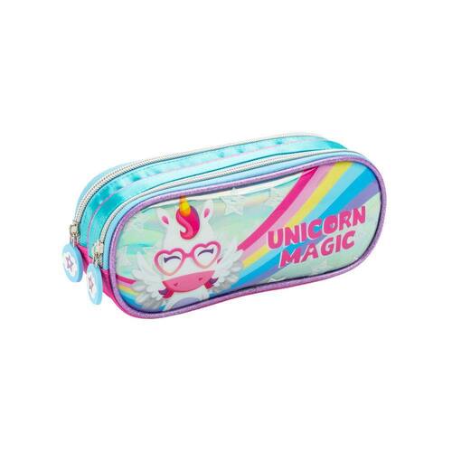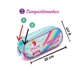 Este estojo escolar duplo é perfeito para os estudantes que adoram unicórnios e arco-íris. Com dois compartimentos espaçosos, ele oferece amplo espaço para guardar lápis, canetas, borrachas e outros materiais escolares essenciais.