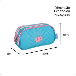 3 compartimentos com fechamento em zíper Puxadores personalizados Up4You Logo emborrachado em alto-relevo Material resistente e durável Design moderno e divertido Amplo espaço para organização dos materiais
