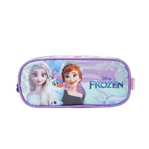 COR: Lilas Tamanho: único Genero: unissex Estojo escolar infantil Frozen Journey DUPLO - Estojo , produzido em cetim estampado e vivos metalizados . Painel frontal em Cetim 3D , compartimento duplo para melhor organização dos objetos e fechamento em zíper com puxadores personalizados.