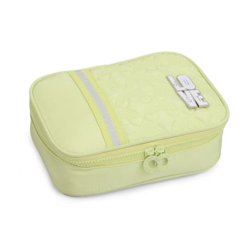 O design cativante e o ponto alto deste estojo: uma faixa horizontal na parte superior apresenta um detalhe brilhante e cintilante que adiciona um toque de glamour. O aplique em alto relevo com a palavra "LOVE", em acabamento metalico ou perolado, reforca o apelo fashionista e jovial. Disponivel em cores vibrantes como o Rosa, o Azul Turquesa e o Verde Suave (amarelo-esverdeado), cada estojo e uma expressao de estilo individual.