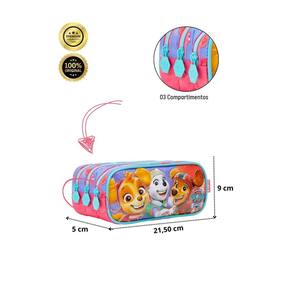Design exclusivo: Estampa da Skye com detalhes em glitter, tornando-o ainda mais mágico. Fechamento por zíper: Facilita o acesso aos compartimentos. Três compartimentos: Espaço amplo para organizar lápis, canetas, borrachas e outros materiais. Detalhes em glitter: Deixa o estojo ainda mais divertido e fashion. Design personalizado: Com a imagem da Skye, para as fãs da Patrulha Canina.