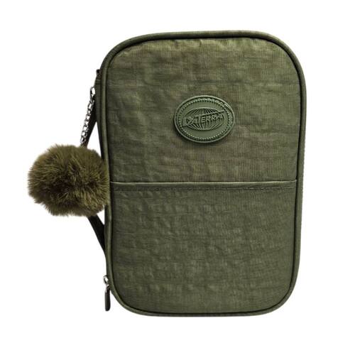 Design e Durabilidade: Confeccionado em tecido resistente de alta qualidade na cor Verde Militar elegante, este estojo não é apenas bonito, mas também extremamente durável e fácil de limpar. Os puxadores de zíper duplos robustos garantem um fechamento seguro e acesso fácil, enquanto o charmoso pompom removível adiciona um toque de estilo e personalidade único ao seu acessório.