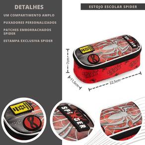Composição: - O estojo é feito com 100% de poliéster, um material resistente e durável. - Possui um puxador personalizado, que facilita o transporte e dá um toque especial ao produto. - Conta com patches emborrachados do Spider, personagem adorado pelas crianças.
