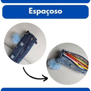 Design Autêntico e Despojado: Jeans "Destroyed" Autêntico: Confeccionado em um material resistente que imita o jeans azul clássico, com acabamento rasgado e desgastado propositalmente, conferindo um estilo "destroyed" super moderno e descontraído. Cada detalhe contribui para um visual único. Pompom Azul Claro: Um pompom macio e felpudo na cor azul claro adiciona um toque divertido e charmoso ao puxador do zíper, criando um contraste interessante com o estilo robusto do jeans. Acabamento Detalhado: Possui um zíper azul escuro que complementa o material e garante um fechamento seguro. Formato Prático: Seu design alongado e cilíndrico é ideal para carregar seus pertences de forma organizada e estilosa. Organização com Atitude: Espaço Versátil: Perfeito para guardar e organizar lápis, canetas, borrachas, apontadores, maquiagens, pequenos acessórios eletrônicos, fones de ouvido ou quaisquer outros itens pessoais. Fechamento Seguro: O zíper resistente garante que seus pertences fiquem protegidos e bem guardados, evitando perdas e bagunça. Leve e Portátil: Com apenas 33 gramas e dimensões otimizadas, é fácil de transportar na mochila, bolsa ou como um acessório de mão, sem adicionar peso extra. Versatilidade para Todas as Ocasiões: Este estojo multiuso pode ser utilizado como necessaire, porta-maquiagem, porta-objetos para a bolsa ou um toque de estilo para a sua mesa de estudos ou trabalho. É ideal para estudantes, jovens e adultos que amam moda e personalidade.