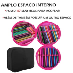 Amplo espaço interno: Possui 2 abas divisórias que te entrega 6 opções para colocar os itens, sendo 5 lugares somando 67 elásticos e 1 outro espaço para itens soltos.