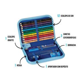 - 12 ecolápis de cor. - 2 canetas esferográficas. - 1 ecolápis grafite. - 1 régua de 15 centímetros. - 1 apontador com depósito. - 1 borracha. Marca: Não Informado