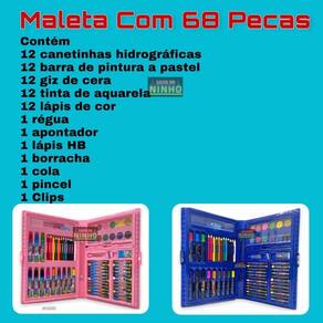 Maleta Escolar Pintura Infantil 68 Peças Canetinha Estojo O Estojo de Pintura além de ser um produto muito divertido, também auxilia no desenvolvimento de vários sentidos ca criança tais como, criatividade, percepção visual, coordenação motora, raciocínio lógico, etc. Um conjunto completo acondicionado em um estojo tipo maleta para melhor organização e transporte. Com ele a diversão está garantida. Idade recomendada: a partir dos 3 anos. Contém: 12 canetinhas hidrograficas 12 barra de pintura a pastel 12 giz de cera 12 tinta de aquarela 12 lápis de cor 1 regua 1 apontador 1 lápis HB 1 borracha 1 cola 1 pincel 2 clips do vendedor: 7 dias Marca: Não Informado