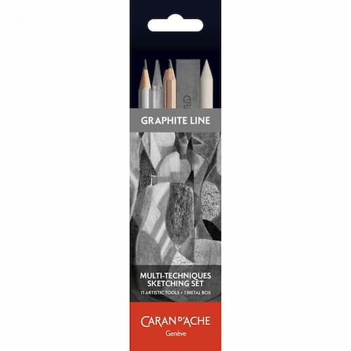 Estojo Multi Técnicas Sketching Set Carandache Com 11 Pecas Estojo com artigos de desenho artístico Caran dAche Sketching. Composto com materiais de série desenho profissional, este set foi cuidadosamente elaborado para atender as necessidades essenciais do artista. Todos os lápis e acessórios acoplados em um exclusivo estojo de lata Caran dAche. Composição do estojo: 4 lápis de desenho profissional Grafwood nas graduações HB / 2B / 6B / 9B 1 lápis integral desenho profissional Grafstone 6B 1 lápis carvão Caran dAche 2 Grafites para desenho Grafcube nas graduações 6B / 9B 1 Esfuminho 1 Apontador de lápis profissional metálico 1 Borracha limpa tipos 1 Estojo de lata exclusivo Caran dAche