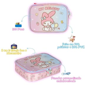 Estojo My Melody Box 100 Pens Passeio Meninas Escolar Kids - UP4YOU - Luxcel A hora de ir para a escola ficou muito mais encantadora Com o estojo da My Melody, a rotina se transforma em um conto de fadas. Leve tudo o que precisa com a praticidade dos elásticos organizadores e a companhia da sua personagem favorita. Com detalhes que apaixonam, ela é a combinação perfeita de magia e funcionalidade. Características Estojo: - 36 Elásticos Organizadores - 100 Pens - Formato Box - Estampa com Personagens Temáticos - Zíper com Puxadores Personalizados Especificações Estojo: - Marca: UP4YOU - Luxcel - Material: 70% Poliéster e 30% PVC - Forro: Poliéster - Medidas Aprox. axlxp : 17cm x 22cm x 6cm - Tema: My Melody - Amigos da Hello Kitty - Cor: Rosa - Capacidade Aprox. litros : 2 litros Conteúdo da Embalagem: - EI42444SRM - 1x Estojo Box My Melody - UP4YOU - Luxcel As cores podem variar entre as imagens mostradas acima e o produto. Imagens meramente ilustrativas. Todas as informações divulgadas são de responsabilidade exclusiva do fabricante. de 90 dias contra defeito de fabricação. Marca: Não Informado