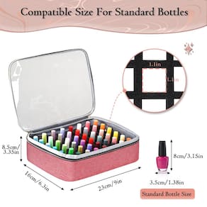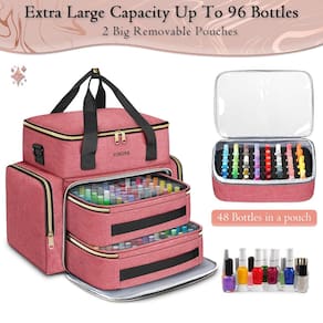 Bolsa de esmalte para unhas Presentes de Dia dos Namorados para mulheres, para namorada, para filha - Capacidade extra grande até 96 frascos: o estojo organizador de esmalte YOREPEK mede 35 x 23; 12,7 x 38,1 cm; O estojo de esmalte vem com 2 bolsas removíveis e cada bolsa é equipada com um pedaço de 48 compartimentos de esponja; até mesmo o organizador de esmalte quase comporta mais de 100 frascos de esmalte de tamanhos pequenos; grande sem precedentes do que qualquer outro estojo organizador de esmalte - Sala de seção superior para suprimentos e lâmpada: a aba dos organizadores de unhas e armazenamento tem um bolso de malha para armazenar pincéis, cortadores, adesivos e outros materiais de arte de unhas; o organizador de esmalte possui um compartimento superior que pode acomodar uma lâmpada de unha, juntamente com divisórias ajustáveis que permitem dividir o espaço sozinho para armazenar várias ferramentas e acessórios para unhas - Tamanho compacto para frascos de esmalte padrão: uma bolsa de esmalte mede 23 x 16 x 8,5 cm e tem um compartimento de esponja removível embutido que cada compartimento mede 2,8 x 2,8 x 7,6 cm serve na maioria dos frascos de esmalte padrão; o estojo de esmalte pode acomodar frascos de esmalte de diferentes formatos e ajudar a proteger seu esmalte de gel de danos; observe que o compartimentos para garrafas abaixo de 80 4 cm de altura - 3 opções na parte de trás da bolsa organizadora de esmalte de viagem para prender com segurança a bolsa à alça da bagagem, tornando sua viagem mais fácil - Várias aplicações e ideias de presente: organizadores de esmalte e bolsas de armazenamento podem ajudá-lo a organizar suas garrafas de esmalte bagunçadas e coletar seus suprimentos de unha em um só lugar; você pode levar seu esmalte na bolsa de transporte e desfrutar de um ótimo momento no salão de unhas com seus amigos; um organizador de acessórios de unhas é um presente ideal para suas amigas, irmã, filha, esposa, que gostam de pintura de unhas, manicure e pedicure - Observação: para proteger seu esmalte, esta bolsa é construída com acolchoamento macio em vez de materiais rígidos. Embora a camada superior possa comprimir se muito peso for colocado sobre ela, esta escolha de design é intencional para evitar danos às suas garrafas de esmalte. Tenha certeza de que isso não afeta a funcionalidade normal da bolsa.