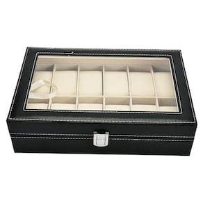 Estojo para 12 relógios com compartimentos individuais revestidos em veludo preto para organização e proteção contra riscos. Design elegante e compacto.Características