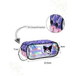 Estojo duplo kuromi - inspirado na personagem kuromi, da sanrio, com visual divertido e cheio de atitude. Combinação de roxo, lilás, e rosa detalhes em rosa e branco. A frente é estampada, frente em pvc , com uma arte encantadora. Os puxadores emborrachados personalizados garantem conforto e facilidade no uso diári para maior durabilidade da peça. O estojo contém dois compartimentos para melhor organização dos itens. Combinando funcionalidade e personalidade, ele se destaca como uma ótima opção de presente para crianças que adoram personagens divertidos e modernos. - frente em pvc holográfico; - dois compartimentos; - zíper tratorado de plástico; - puxadores emborrachados personalizados; - material: poliester Dimensões: - largura: 21.5cm - altura: 9cm - comprimento: 7cm Peso: 100gr Cuidados: - guarde em um local seco e arejado evitando locais úmidos. - evite colocar excesso de peso no produto para não forçar os zíperes e costuras. - proteja os objetos cortantes e/ou pontiagudos evitando o contato direto com o produto. - evitar altas temperaturas. - cores claras poderão manchar quando em contato com outros objetos ou roupas de cores pigmentadas. Dicas de limpeza: - para a limpeza utilize apenas pano úmido com sabão neutro. - não deixar de molho e secar a sombra. Marca: Não Informado