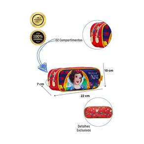Design exclusivo: Estampa da Branca de Neve com detalhes encantadores. Dois compartimentos: Espaço amplo para organizar lápis de cor, canetas, borrachas e outros materiais. Fechamento por zíper: Facilita o acesso aos compartimentos. Cursor personalizado: Um toque especial que as meninas vão adorar. Material resistente: Garante durabilidade e resistência no dia a dia escolar.