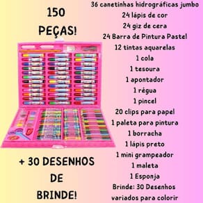 Kit Completo em Maleta Resistente: O conjunto contém 150 peças, incluindo lápis de cor, canetinhas hidrográficas, giz de cera, tintas aquarelas, régua, borracha, apontador, tesoura e muito mais Tudo isso é organizado em uma maleta resistente e fácil de transportar, para que você possa levar seus materiais de arte para onde quiser.