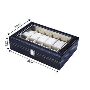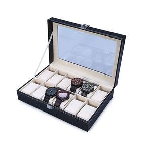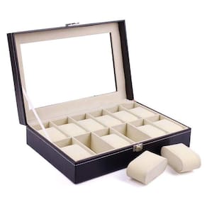 Valorize ainda mais sua coleção de relógios. Estojo para 12 relógios, feito de madeira e revestido externamente de courino e internamente de veludo. Costura em tom branco, dando mais elegância aos seus relógios. Acomodam perfeitamente e com segurança, relógios femininos ou masculinos. Seu fecho prateado é muito bonito e reforçado, não deixando que o estojo se abra em qualquer descuido. Tamanho do estojo para 12 relógios: 33 cm X 20 cm X 9 cm. Com tampa em plástico super reforçado com aparência idêntica ao vidro. São 10 almofadas distribuídas em casulos devidamente separados por repartições também aveludadas. Cada casulo (4,5cm X 8,5 cm), vem acompanhado de uma almofada de veludo para acomodar e proteger o relógio