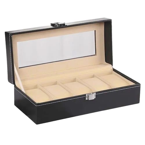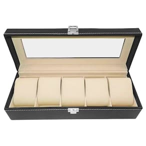 Valorize ainda mais sua coleção de relógios. Estojo para 6 relógios, feito de madeira e revestido externamente tecido sintético e internamente de veludo. Costura em tom branco, dando mais elegância aos seus relógios. Acomodam perfeitamente e com segurança, relógios femininos ou masculinos. Seu fecho prateado é muito bonito e reforçado, não deixando que o estojo se abra em qualquer descuido. Tamanho do estojo para 5 relógios: 25 cm X 11 cm X 8 cm. Com tampa em plástico super reforçado com aparência idêntica ao vidro. São 5 almofadas distribuídas em casulos devidamente separados por repartições também aveludadas. Cada casulo (4,5cm X 8,5 cm), vem acompanhado de uma almofada de veludo para acomodar e proteger o relógio