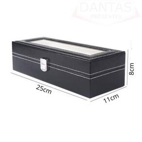Valorize ainda mais sua coleção de relógios. estojo para 6 relógios, feito de madeira e revestido externamente tecido sintético e internamente de veludo. costura em tom branco, dando mais elegância aos seus relógios. acomodam perfeitamente e com segurança, relógios femininos ou masculinos. seu fecho prateado é muito bonito e reforçado, não deixando que o estojo se abra em qualquer descuido. tamanho do estojo para 5 relógios: 25 cm X 11 cm X 8 cm. com tampa em plástico super reforçado com aparência idêntica ao vidro. são 5 almofadas distribuídas em casulos devidamente separados por repartições também aveludadas. cada casulo 4,5cm X 8,5 cm , vem acompanhado de uma almofada de veludo para acomodar e proteger o relógio