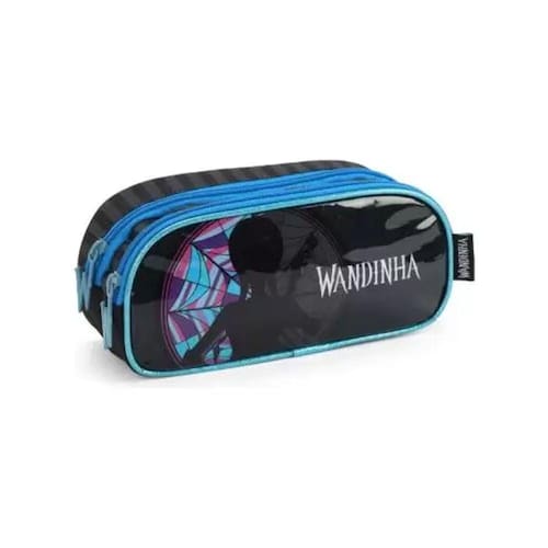 O estojo possui compartimento duplo. É fabricado em poliéster e parte frontal em PVC, com puxador personalizado. Os materiais escolares ficarão ainda mais organizados graças ao amplo compartimento duplo.