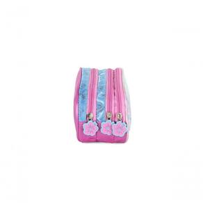 Possui dimensões de 22 x 10 x 8 cm, capacidade aproximada de 1 litro, sendo classificado como estojo médio. Confeccionado em material resistente, conta com zíper personalizado da marca, design holográfico exclusivo e três compartimentos, garantindo maior organização para lápis, canetas e acessórios escolares.