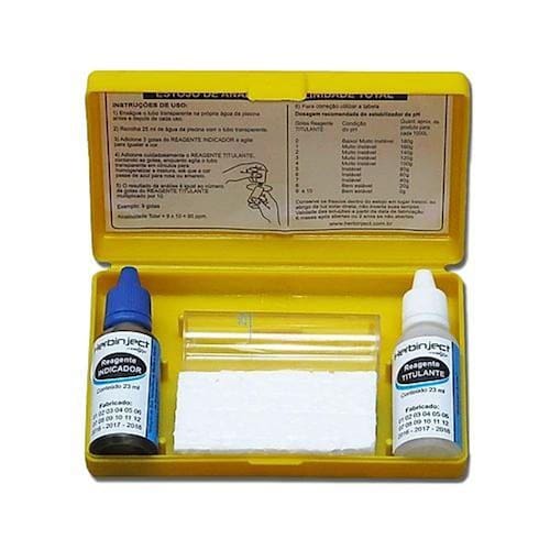 O Estojo de teste é um item indispensável para quem deseja uma piscina com água limpa e cristalina, com ele você controla os níveis de alcalinidade total no tratamento da piscina.Por que usar o estojo de teste para alcalinidade totalEstojo desenvolvido para análise de alcalinidade total da água da piscina.O kit é composto por um tubo para a leitura do parâmetro, e respectivos reagentes para a determinação da faixa em que se encontra a alcalinidade total.É extremamente importante que a Alcalinidade Total em águas de piscinas seja mantida entre 80 e 120 ppm dependendo do cloro utilizado , pois isso confere estabilidade ao pH e facilita seu controle, melhora a atuação dos produtos utilizados no tratamento e a qualidade da água. A análise da alcalinidade total deve ser feita pelo menos uma vez por semana. Ean: 7892329736585