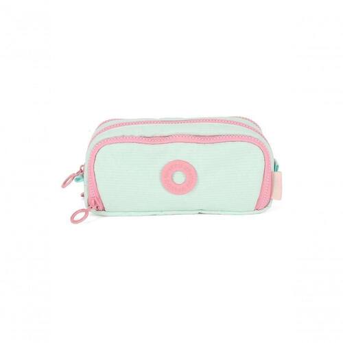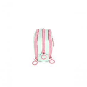 O estojo triplo é confeccionado em algodão resistente, com logo personalizado em cor de destaque e zíper exclusivo da marca. Seu design moderno e funcional oferece três compartimentos amplos, ideais para organizar canetas, lápis, borrachas e demais acessórios escolares.