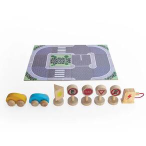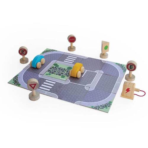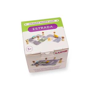 Estrada - Lume Brinquedos Conjunto com 2 carrinhos, 4 sinais de trânsito, 1 sinaleira, 1 bomba de abastecimento e 12 quadrados com impressões para formar uma divertida estrada. Com a combinação de peças desse conjunto é possível construir diferentes rotas e formatos. A criança é a urbanista da cidade Durante a brincadeira são desenvolvidas e estimuladas habilidades como: a imaginação, a criatividade, a percepção espacial, a exploração e organização do espaço, e a atenção para o aprendizado dos sinais de trânsito. Material utilizado: madeira maciça, elástico e micro-ondulado Kraft impresso. Acabamento: tinta e cera atóxicas. Embalagem: Caixa em cartão duplex e micro-ondulado Kraft com impressões.