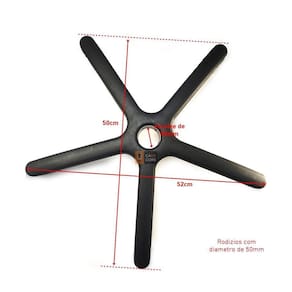 Produto com qualidade nacional Peso Max. Recomendado: 110 kg Classificação: Giratória; com rodízios. Modelo: Nacional Medidas: Expressas especificamente na última imagem do anuncio. Encaixe do Pistão: 50mm Diâmetro do Rodizio: 50mm. Encaixe do Rodizio: 11x20mm Modelo rodízios: Rodízios Silicone. anti-risco e anti-ruido Estrutura: Em nylon injetada Cor: Preta Para: Maioria dos modelos de cadeira de escritório giratória, atendendo modelos menores devido ao diâmetro da estrela, atende modelos secretários, executivos e até modelos diretores dependendo do modelo.