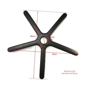 Produto com qualidade nacional Peso Max. Recomendado: 110 kg Classificação: Giratória; com rodízios. Modelo: Nacional Medidas: Expressas especificamente na última imagem do anuncio. Encaixe do Pistão: 50mm Diâmetro do Rodizio: 50mm. Encaixe do Rodizio: 11x20mm Modelo rodízios: Rodízios Silicone. anti-risco e anti-ruido Estrutura: Em nylon injetada Cor: Preta Para: Maioria dos modelos de cadeira de escritório giratória, atendendo modelos menores devido ao diâmetro da estrela, atende modelos secretários, executivos e até modelos diretores dependendo do modelo.