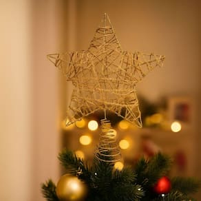 Seu acabamento combina o brilho do glitter dourado com a delicadeza do barbante rústico entrelaçado, criando um visual sofisticado e acolhedor. A base em espiral permite encaixe seguro no topo da árvore, proporcionando fácil fixação e ótimo acabamento.