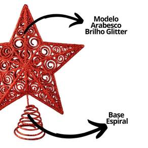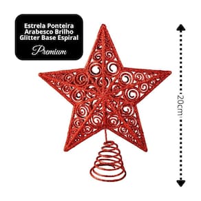 Com design arabesco tridimensional, acabamento em glitter vermelho brilho intenso e base espiral metálica, esta ponteira é ideal para compor árvores de todos os estilos, do clássico ao moderno, proporcionando um toque final de elegância e luminosidade.