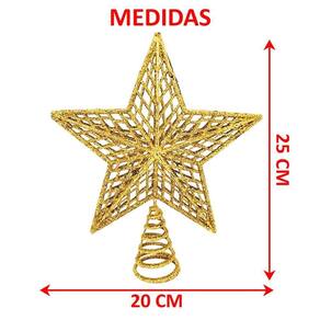 Características Gerais do Produto: - Material: Plástico - Modelo: Estrela Para Árvore de Natal - Cor: Dourado - Dimensões aproximadas: Altura 25cm x Largura 20cm Garantia: - Garantia do site - 1 Mês