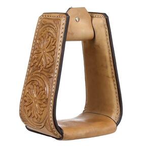 Estribo para selas Western confeccionado em madeira reforçada na parte externa com chapa de zinco e revestida em couro bordado modelo floral, possui aproximadamente 10cm de largura lateral, a base é fabricada em couro liso e possui aproximadamente 11,5cm de largura.