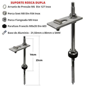 01 Parafuso com Rosca Dupla em Aço Inox: M8x250mm 01 Chapa de Fixação em Alumínio: 82x32x6mm 03 porcas Sextavadas Flangeadas Serrilhadas em Aço Inox: M-8 01 Anel para Vedação em Borracha: M8x13mm 01 Parafuso Cabeça Martelo em Aço Inox: M-8x20mm 01 arruela de Pressão em Aço Inox: M-8 01 porca sextavada em Aço Inox: M-8 Marca: Perfil Master Ean: 7908388810293