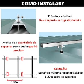 Estrutura Suporte Fixador Placa Painel Solar Alumínio e Inox Para Telha Fibro ou Ondulada em Viga Madeira Perfil Master Suporte Fabricado em Alumínio e Aço Inox para Fixação em Vigas de Madeira Este suporte de fixação permite ótimo custo x benefício, pois é fixado na estrutura do telhado, dispensando estrutura extra para fixação. Fabricado em aço inoxidável e alumínio de alta resistência e durabilidade para todos os padrões climáticos, este suporte foi desenvolvido especialmente para fixar a estrutura em alumínio de sustentação dos painéis solares em vários tipos de telhados, sem a necessidade de alteração na estrutura. Utilizando materiais não ferrozos é ideal para todo tipo de região, sendo resistente inclusive, à maresia do litoral. Possui 2 regulagens de altura devido a sua rosca dupla, se adaptando a todo tipo de telhas e permitindo perfeito nivelamento das placas.