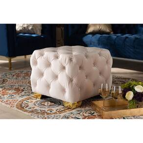 Baxton Studio Avara Glam and Luxe Tecido de Veludo Bege Claro Estofado Acabamento Dourado Botão Tufado Otomano
