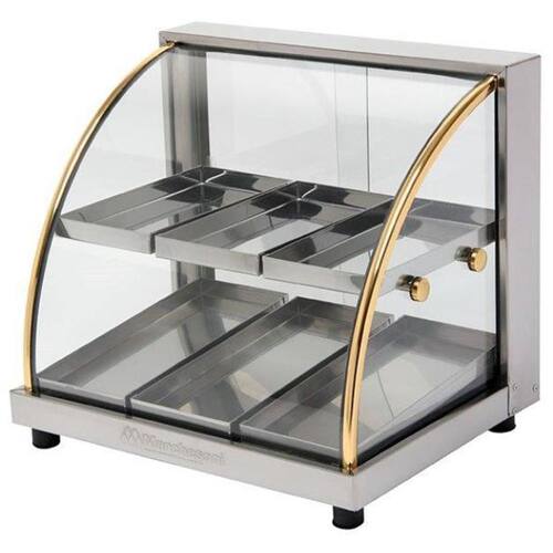 . vidro curvo cristal . bandejas em aço inoxidável . perfil/friso dourado em plástico ABS . termostato bimetálico regulável para economia de energia elétrica . umidificador . produto com sêlo compulsório INMETRO. . resistência tubular de baixo consumo 150W - 0,15kWh . voltagem: 110v com resistência espiral . umidificador . industria brasileira