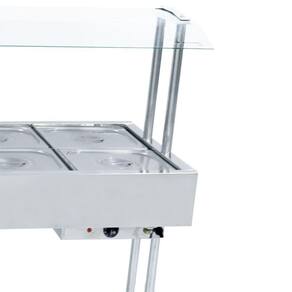 Esta estufa buffet conta com corpo e banho-maria fabricados inteiramente em aço inoxidável 430, proporcionando maior durabilidade ao equipamento. Seus pés são cromados, confeccionados com tubos inteiros, livre de solda em sua base. Possui cobertura de vidro curvo inteiro de 4 mm, para melhor visibilidade e higiene ao servir as refeições. Além disso, o carro buffet aquecido possui 10 cubas quentes 1/2 feitas em aço inox e de acordo com o padrão mundial Gastronorm.