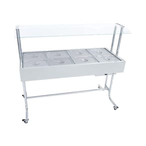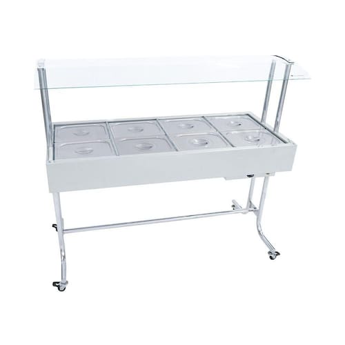 Esta estufa buffet conta com corpo e banho-maria fabricados inteiramente em aço inoxidável 430, proporcionando maior durabilidade ao carro buffet. Seus pés são cromados, confeccionados com tubos inteiros, livre de solda em sua base. Possui cobertura de vidro curvo inteiro de 4 mm, para melhor visibilidade e higiene ao servir as refeições. Além disso, o carro buffet aquecido possui 8 cubas quentes 1/2 feitas em aço inox e de acordo com o padrão mundial Gastronorm.