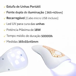 Mantenha suas unhas impecáveis com a Estufa de Unhas Portátil. Equipado com fonte dupla de iluminação (365+405nm), esta estufa recarregável vem com um cabo micro USB incluso para sua conveniência. Com LED UV para cura das unhas, possui uma potência máxima de 18W e um tempo médio de duração de 50.000 horas. Compacta e eficiente, mede 165x55x45mm, sendo perfeita para uso em casa ou em viagens.